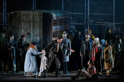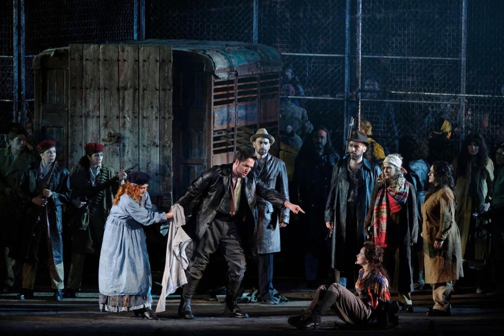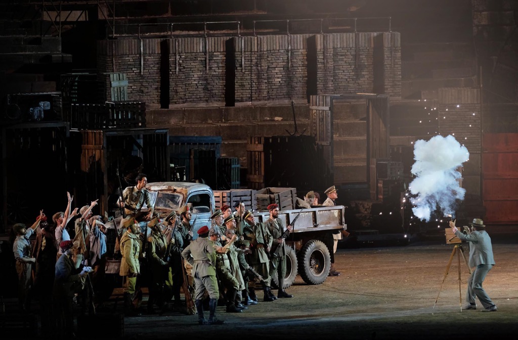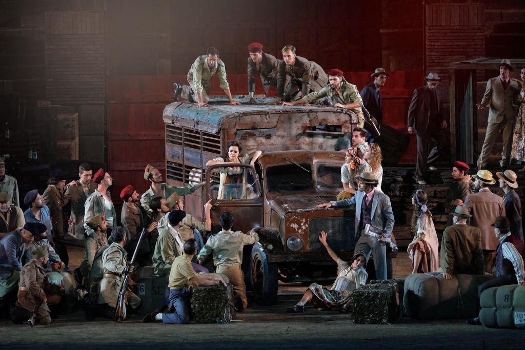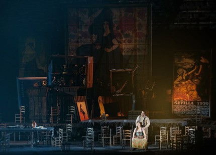Перенос в тридцатые годы минувшего столетия никак не повлиял на драматургию, которая осталась нетронутой. Все развернулось честь по чести, согласно развитию классического либретто Мельяка и Галеви, без изобретения каких бы то ни было смыслов, о которых сотрудники Бизе не подозревали. Просто вся история была разодета в иные одежды; впрочем, без традиционных атрибутов Испании не обошлось: желто-красные флаги полыхали в ночном небе, справа и слева танцовщики исполняли несложные движения (хореография Леды Лойодиче), а артисты старательно восклицали «оле!». Кто франкисты, а кто республиканцы, идут ли военные действия или конфликт только тлеет, осталось непрояснённым.