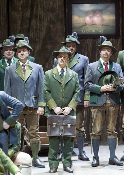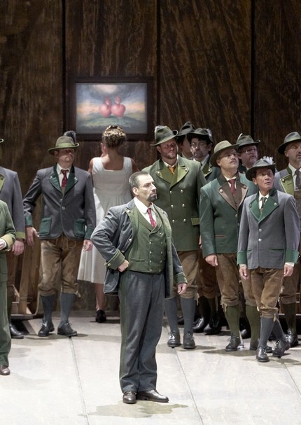 Новая встреча со спектаклем режиссёра Андреаса Хомоки меня почти не расстроила: мизансценные нестыковки с текстом и музыкой, нелепость дирндля (или трахтена, уж кому как угодно, ибо там и то, и это), интертекстуальные передёргивания аксессуарных ходов предыдущих концепций (так, например, в известном строительном спектакле Ричарда Джонса плюшевую тушку лебедя по баварской сцене носил Лоэнгрин, а у Хомоки по венской сцене её носит Эльза, отчего возникает эффект дежавю), равно как и сногсшибательное использование иконических символов христианства в регистре фольклорного полустёба (у оформителя Вольфганга Гуссмана «пламенеющее сердца Христа» задваивается в эротически фривольной эмблемке «Когда два сердца бьются вместе») сегодня никого не удивляют, и огорчаться по этому поводу уже немодно.