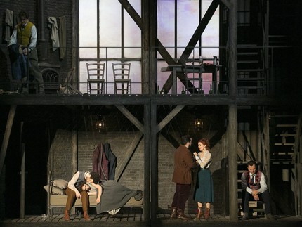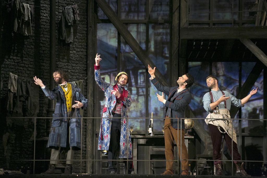 Симметрично-контрастная структура четырехактного (точнее – четырехкартинного) либретто определяет и сценографическую симметрию постановки, которая, как ни странно, в общем и целом, довольно четко коррелирует с лондонской постановкой Ричарда Джонса (естественно, в той мере, в которой вообще возможно сопоставить живой спектакль и киноэкранный образ), но средства выразительности у молодого оптимиста Жана-Ромэна Весперини – более тонкие, более изысканные, чем у его британского коллеги, чертам режиссерского мышления которого в «Богеме» присущи прагматизм жизненного опыта и, с позволения сказать, «мягкая брутальность». И на сей раз постановка «Богемы» Пуччини – снова локальный космос маленького человека в большом человеческом мироздании, а утлый островок богемы словно дрейфует в многоликом людском океане света и тьмы.