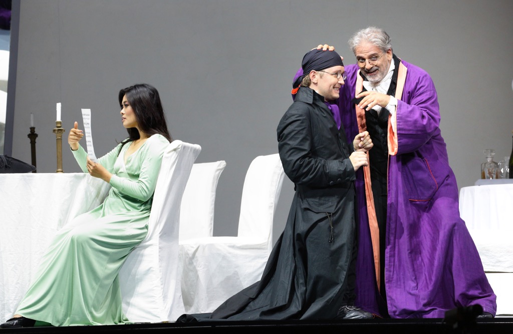 Меццо-сопрано из Японии Айя Вакизоно («академистка» 2014 года) в партии Розины в «Севильском цирюльнике» (после скепсиса рецензента от ее Клариче в «Пробном камне») впечатляет, пожалуй, несколько больше, но то, что это латентное сопрано, не вызывает сомнений и на сей раз. Что ж, такое наблюдается сплошь и рядом, и всё бы ничего, если бы речь не шла о Пезаро. Зато в этой постановке – потрясающая итальянская тройка мужских персонажей! Баритон Давиде Лучано («академик» 2012 года) – Фигаро. Довольно известный артистически утонченный баритон Пьетро Спаньоли – Дон Бартоло. Маститый бас-ветеран Микеле Пертузи, который после своей незабываемой интерпретации главной партии в «Магомете II» не появлялся в Пезаро целое десятилетие, – Дон Базилио. В небольшой партии Иркано в «Риччардо и Зораиде» великолепен могучий итальянский бас Никола Уливери, а в компактной «Адине» в весьма эффектной и выигрышной партии Калифа скрупулезностью погружения в стиль музыки, интеллектуальным благородством и восхитительно-мягкой кантиленой подкупает итальянский баритон Вито Прианте.