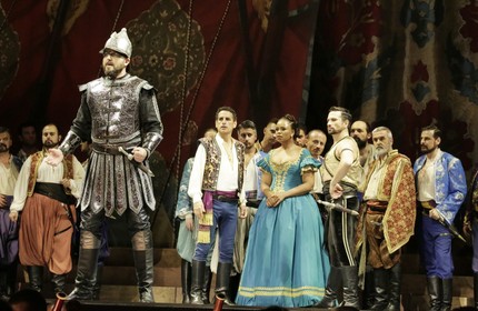 Расписная цветистость спектакля – заведомо европейского толка. В мужских костюмах царит пестрая цыганщина, в женских – стилизация под XIX век. Но какая, в сущности, разница в том, что переодетый паладин Риччардо ради спасения своей возлюбленной Зораиды, похищенной из лагеря крестоносцев нубийским царем Агорантом, вторгается в его владения не под видом проводника-африканца при Эрнесто, посланце-парламентарии крестоносцев, а под видом залихватского цыгана или даже казака, подпоясанного кушаком! Какая разница, в каком наряде Зомира, «отставная жена» Агоранта, строит планы мести в отношении соперницы, которые подведут под эшафот и главных героев, и отца Зораиды Иркано, «рыцаря печального образа», попытка освобождения которым своей строптивой «заблудшей» дочери кончается фиаско! Какая разница, в какие одежды и формы облачен наивный хеппи-энд с внезапным появлением Эрнесто во главе армии рыцарей, которые, конечно, сразу же побеждают Агоранта, а Риччардо великодушно дарует ему жизнь!