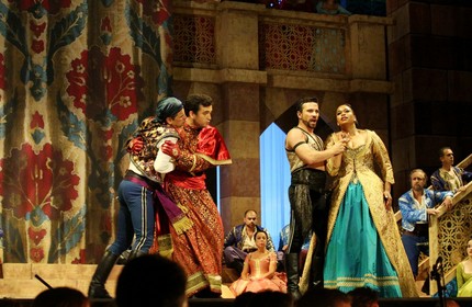 Три постановки 39-го фестиваля, прошедшего в год 150-летия со дня смерти Россини (а умер он 13 ноября 1868 года в Париже) и второй раз без его «лучшего друга» Альберто Дзедды, – продукции новые («Адина» – совместный проект с Уэксфордским фестивалем). «Риччардо и Зораида» – постановка канадца Маршала Пинкоски, и его творческие истоки как балетного танцовщика в сочетании с заведомо искусственно внедренной в спектакль хореографией Жаннет Лайюнес Зинг (его супруги и в прошлом также классической танцовщицы) смогли явить на свет лишь визуально красивое, но драматургически пресное, наивное, слащаво-иллюстративное действо. Но всё познается в сравнении. На контрасте с беспомощной инсталляцией «Осады Коринфа» на этой же сцене в прошлом году постановка «Риччардо и Зораиды» при всей ее эклектике в сценографии и хореографии и даже при отсутствии действенно живых, захватывающих мизансцен, место которых заступила условно-балетная ходульная пластика, в довольно милую, непритязательную эстетику спектакля-концерта вписалась вполне органично.