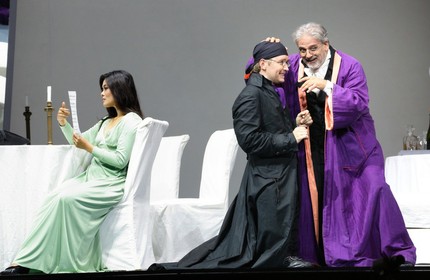 На сей раз в своем изысканно-элегантном узнаваемом стиле, который можно назвать восхитительно рафинированной неоклассикой, ее поставил выдающийся итальянский мэтр Пьер Луиджи Пицци, как всегда представший триединым архистратигом в аспекте режиссуры, сценографии и костюмов (его ассистентом и художником по свету выступил Массимо Гаспарон). Этот режиссер никогда не стремится к аутентичности воссоздания эпохи сюжета, но аутентичность его постановок по отношению к музыке – то, чем они всегда захватывают без остатка, то, что ни на миг не дает пребывать зрителю в состоянии равнодушия! Органически цельная, психологически мощная, даже можно сказать, зримая аутентичность по отношению к музыке проступает в спектакле и на сей раз. Он весьма современен, но назвать его андеграундом, ставящим всё с ног на голову, понятно, нельзя.