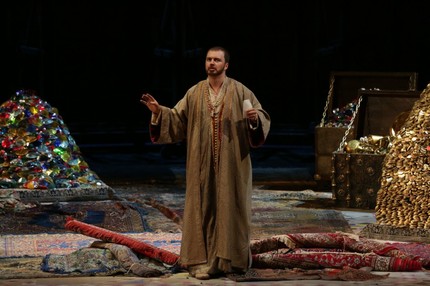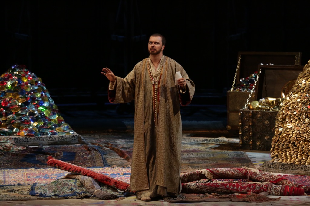 Эта постановка, прежде всего, – царство басов, во всяком случае, согласно ее буклету, баритонов в ней нет, а басов – пять (при двух сопрано, в двух составах вполне сноровистых и добротных, и двух тенорах, Надире и Калафе). По аналогии с «академиками» уместно вспомнить, что в 2014–2016 годах Александр Рославец прошел через горнило Молодежной программы Большого театра России (художественный руководитель – Дмитрий Вдовин). В партии Али-Бабы своего менее опытного коллегу Паоло Инграшотту и по вокальному, и по актерскому мастерству он явно на сей раз превзошел. И если итальянский бас был пока лишь по-ученически прилежен и аккуратен, то в образ, выстроенный на бархатной кантилене и психологических нюансах, роскошный белорусский бас-кантанте смог внести черты как «философичности», так и задорной здоровой иронии!