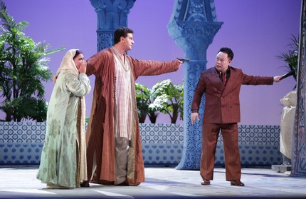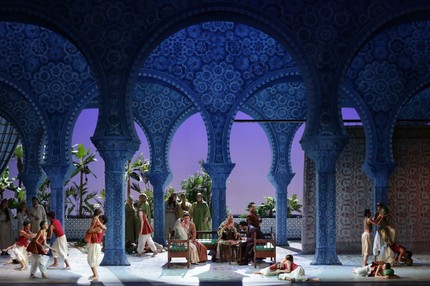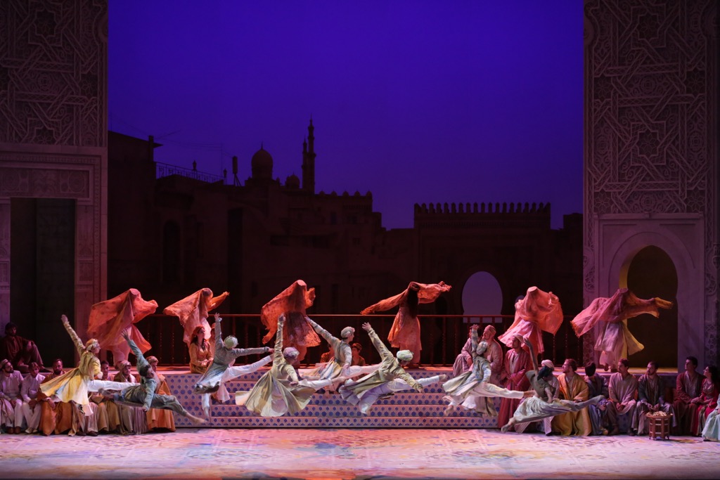 Лилиана Кавани рассказывает сказку, адаптированную либреттистами для оперы, с одной стороны, довольно серьезно и обстоятельно, но с другой стороны, – светло, весело, иронично, словно всё время подчеркивая, что это не лирическая трагедия, а лирическая комедия. Конечно, это не итальянский искрометный фарс, но некая итальянская бравада в весьма серьезных драматических коллизиях либретто, в котором хватает случайностей и удобных с точки зрения сюжета совпадений, конечно же, присутствует. Режиссер делает один довольно банальный, но точно бьющий в цель ход, рассказывая оперную историю как фантом в воображении четверки положительных героев – Али-Бабы, Делии, Надира и Абул-Гасана (отрицательные герои – конечно же, разбойники).