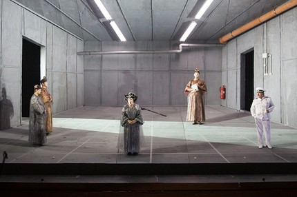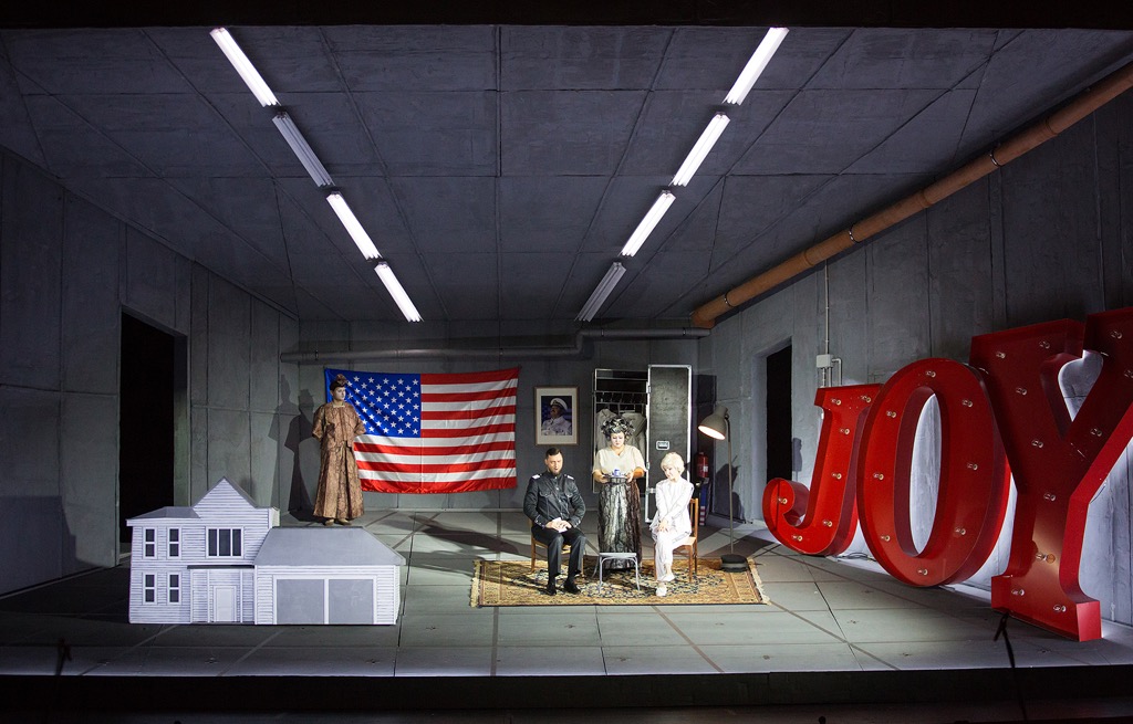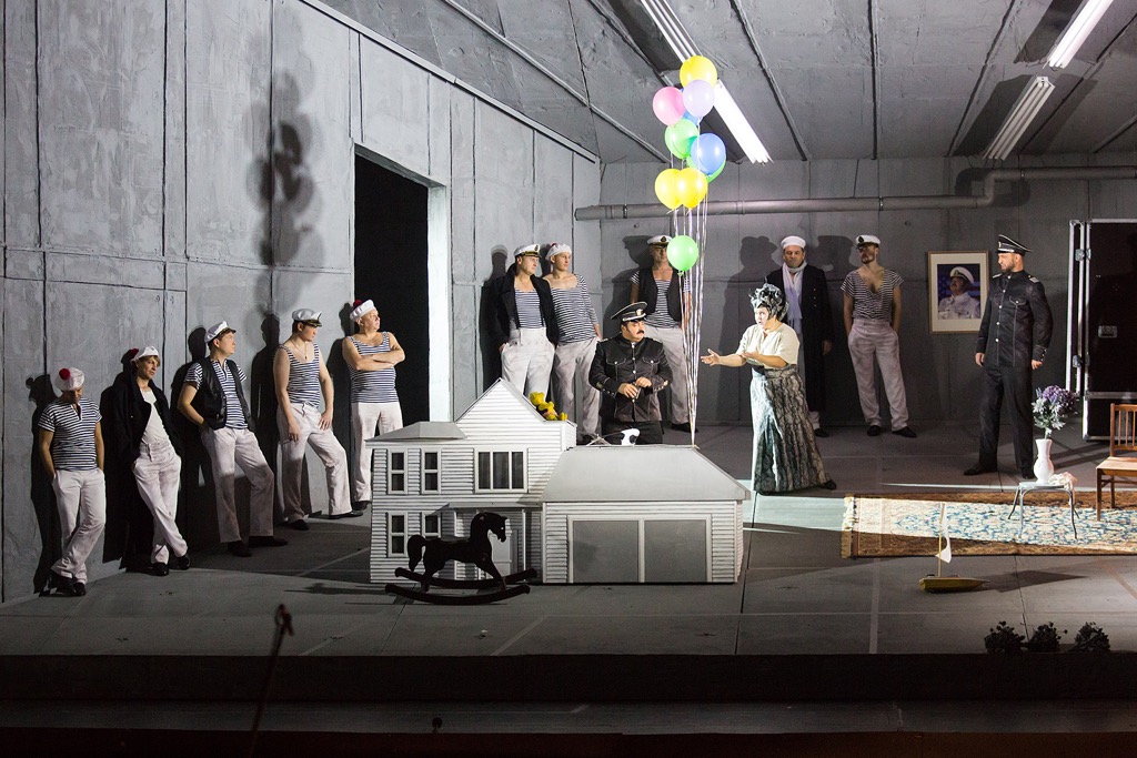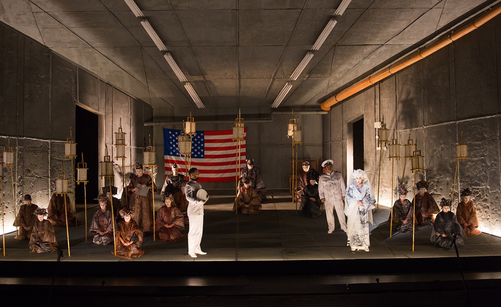 Японская бабочка Чио-Чио-сан после отъезда бросившего его Пинкертона деградирует в американский «кокон» (его напоминает белый спортивный костюм и белый короткий парик главной героини). Превращаясь с финальным харакири в прах, «кокон» навечно остается в возведенной на сцене серой бетонной коробке, как в траурной урне. В этой инсталляции Пинкертон, конечно же, не обеляется и не идеализируется, но и трагедия Чио-Чио-сан (Мадам Баттерфляй) никакого сочувствия не вызывает: какая разница – одной бабочкой меньше, одной больше… А сачок, поймавший и сгубивший ее, похоже, был сшит именно из американского флага, который водружается в бетонной коробке Чио-Чио-сан Пинкертоном. Гигантская копия этого флага служит и занавесом-водоразделом спектакля, идущего в двух актах. Но как же всё это банально и абсолютно бессодержательно!