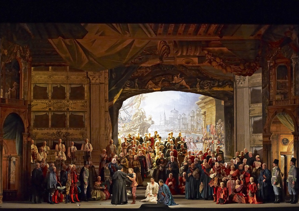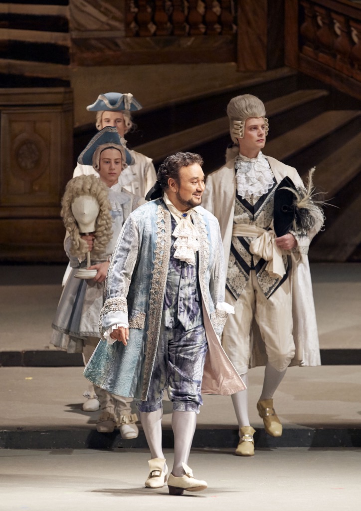 Это ярко расписанные подвижные задники, кринолины, парики, убогая разводка артистов по сцене, — словом, та самая оперная продукция эпохи необъятных в своём величии певцов и певиц.