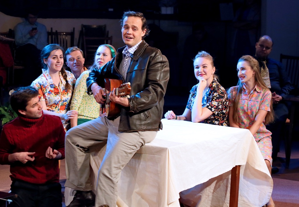 Арена ротонды – зеленая лужайка, рассаживаясь по периметру которой (точнее, по двум сторонам ротонды, соответствующим двум лестницам, что ведут в нее), зрители с удивлением видят, что на ней уже мирно спят пятеро «вьюношей» – четыре пастыря и Орфей. Поначалу они неразличимы, ведь по социальному статусу, что выдает нехитрого покроя одежда «простого советского человека», все равны и, в принципе, одинаковы, но, когда компания просыпается, четверо, играясь и резвясь, отбирают у пятого повидавший виды кожаный «ретропортфель», и этот пятый – «парень из нашего двора» – сразу же выделяется из общей массы: не портфель ему нужен, как всем, а гитара, появляющаяся у него руках. Он – певец, и певец счастливый, ведь грядет его свадьба с нимфой Эвридикой: наконец-то, она согласилась стать его женой! А его друзья-пастыри (пастухи) и нимфы, в духе правил и норм «социалистического общежития» 70-х, разделяют радость Орфея, как могут. Просто и незатейливо, пусть и орудуя при этом гранеными стаканами не в сáмой эстетически изысканной манере, но зато по-настоящему радуясь жизни – искренне и чисто! На пиру особо выделяется колоритная, смачная Нимфа (сольный персонаж), а Вестница с трагической вестью о смерти Эвридики появляется в антураже уборщицы «с орудиями своего производства» – и это всё очень точные срезы эпохи «всеобщего благоденствия».