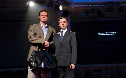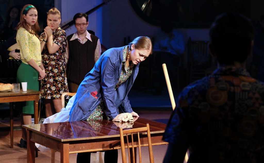 В команде Георгия Исаакяна – сценограф Ксения Перетрухина, художник по костюмам Алексей Лобанов и художник по свету Евгений Ганзбург, а погружение в атмосферу 70-х начинается с гардероба, но не того, о котором обычно говорят, что «театр начинается с вешалки». Вешалка, конечно же, была: как-никак, а осень всё-таки взяла да наступила! Но была и стена из шкафов-гардеробов, которая сразу после входа в фойе отгородила от него небольшое пространство. И вот, наконец, под звуки фанфар, доносящихся из затемненного фойе, капельдинер открывает в импровизированной стене центральный гардероб – и, входя через его двери, благо задней стенки во «входном гардеробе» нет, публика начинает свое чинное движение по красно-зеленому «кремлевскому» ковру в направлении ротонды.