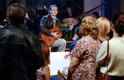 Понятно, что мы – уже в 70-х, но пока непонятно, зачем мы в них оказались. Лишь в самом финале оперы, в которой на всём ее протяжении находишься вместе с персонажами прямо в сердце интриги, понимаешь, что нас пригласили на чествование Орфея, сумевшего противостоять аду и вернуться оттуда живым. А значит, воссоздается предыстория его славного подвига, жизненный путь истинно народного героя в рамках торжественного правительственного мероприятия-официоза. В плане мизансцен само действо чрезвычайно увлекательно, но слово «зрелищно», возможно, будет и не совсем уместно, ибо на первом месте – метафоричность, которая иногда чувственно-нежна, а иногда – с оттенком жизненной брутальности, но эти контрасты 70-х отражены и осмыслены вполне адекватно.