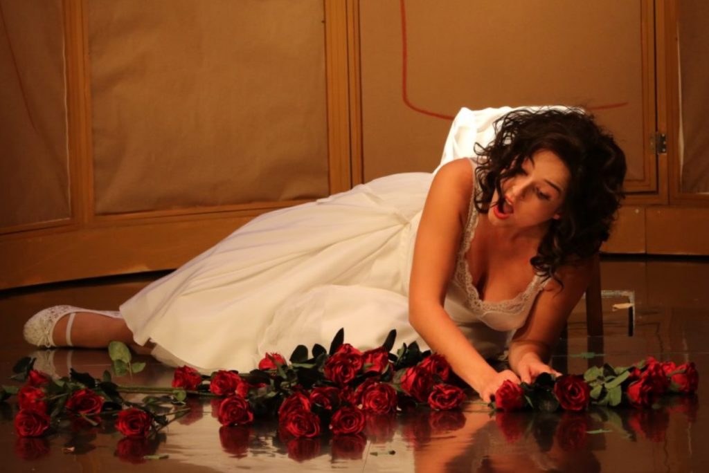 Свет в этом темном туннеле — Джильда, запертая в белом платье в белой «клетке».