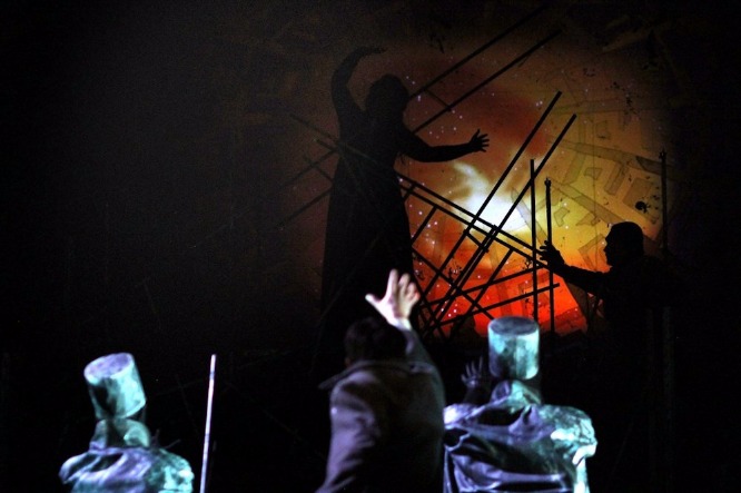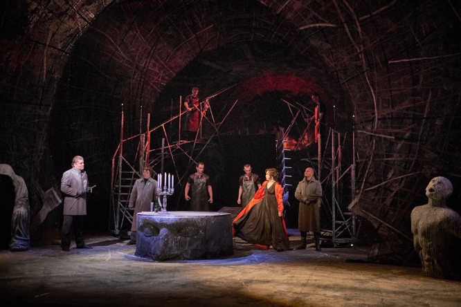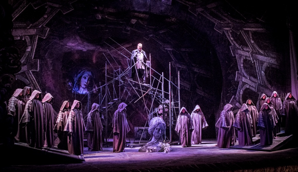 «Каменная труба» – это древние вечные камни «вечного города», и наиболее отчетливо их «фактура» проступают в первом акте. При этом они больше взывают к ассоциации не с круглым Замком Святого Ангела, а с монументальным Колизеем, едва ли не главным символом современного туристического Рима. Во втором акте эти камни «задрапированы» кладкой прутьев «гигантского костра» – и сей костер, даже когда Скарпиа еще жив и пока не сражен кинжалом Тоски, уже полыхает где-то далеко, но всё еще в этом мире. Лишь в самом финале оперы с гибелью влюбленных героев заревом этого костра наполняются и выси в масштабах звездной вселенной… Все эти сценографические аллюзии работают в спектакле поразительно безотказно и действенно! Восходя в финале первого акта на помосты-леса, Скарпиа под конец своего монолога на фоне Te Deum надевает на себя маску мщения, даже не подозревая, что на сей раз примеряет маску собственной смерти. Во втором акте из этих помостов-лесов складывается что-то наподобие эшафота, но не для казни, а для пыток Каварадосси, помогающего сбежать Анджелотти, бывшему консулу Римской республики и, стало быть, политическому преступнику австрийского режима, на страже которого и стоит Скарпиа. Расстрельный подиум Каварадосси в третьем акте – самодостаточно скромная сцена в «театре одного актера», но финал с Тоской, бросающейся в звездное зарево под куполом «небесного храма», невероятно эффектен!
