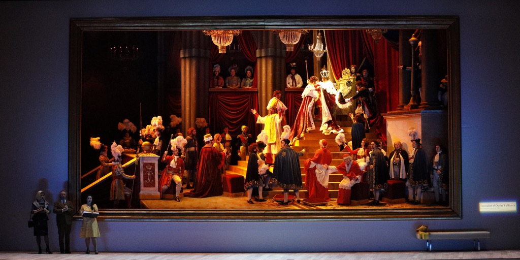 Ясно теперь, что избранная десятка персонажей – приглашенные по совместительству «господа-актеры». Одно из двух: либо мы свидетели презентации картины Франсуа Жерара «Коронация Карла X», которая предваряет ее экспозицию в галерее, либо – за тщетностью арендовать такое знаменитое парадное полотно – свидетели компромисса, который галерее для поднятия ее рейтинга всё равно важен. Составить живую объемную картину по образу и подобию плоского оригинала – такое же ведь искусство, как и складывание пазла оперного спектакля. В данном случае при сюжетной зыбкости либретто категория «что?» не так уж и важна, но зато категория «как?» реализована изумительно, и ответ на вопрос «зачем?», адресуемый этой постановке, очевиден. Затем, чтобы пазл музыки Россини собрался в мощное визуально-объемное измерение театра. И он ведь и вправду собрался!