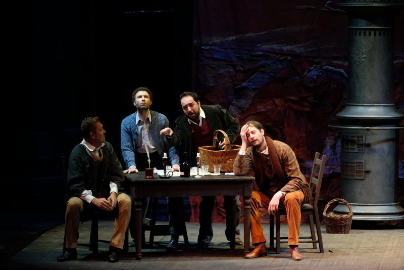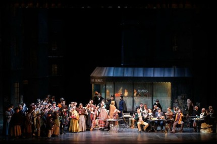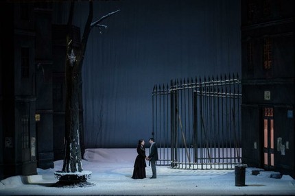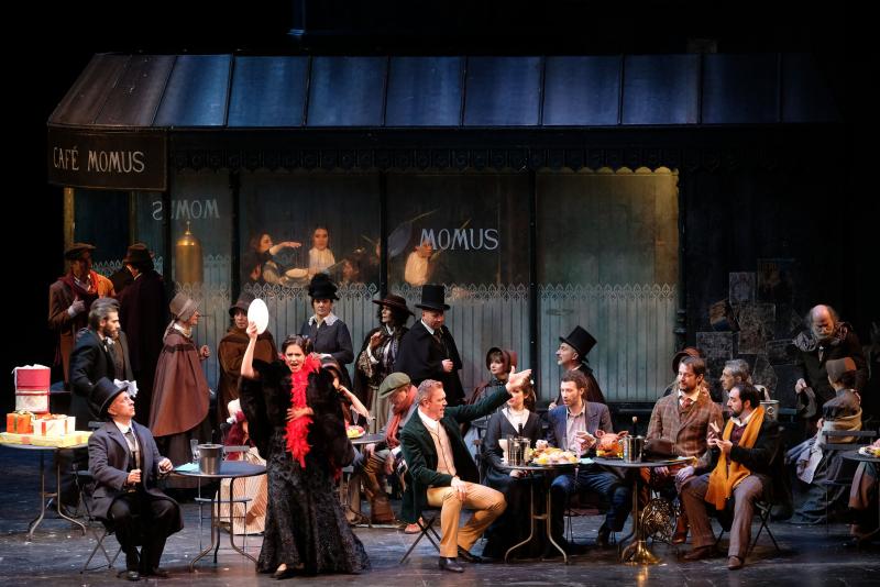 Режиссура Патрони Гриффи крайне деликатна, почти не видна (надо принимать во внимание, что это восстановление, и вполне возможно, что детали мизансцен безвозвратно утеряны). Думается, что в свое время она была сосредоточена на работе с поющими актерами, коими были люди такого калибра, как Френи и Паваротти, а также Лучо Галло – Марсель, Аннализа Талиенто – Мюзетта и Пьетро Спаньоли – Шонар. В том зрелище, что предстает двадцать два года спустя на сцене театра Филармонико, очевидна недоработка, если не хаос, массовых сцен: в чудесной мозаике, коей является канун Рождества в Латинском квартале, кусочки не складываются в гармоничную картину, взрослый и детский хоры толпятся на авансцене, и ни один артист, кажется, не имеет четкого представления, где ему стоять и куда двигаться. Как если бы все эти массы остались «бесхозными».