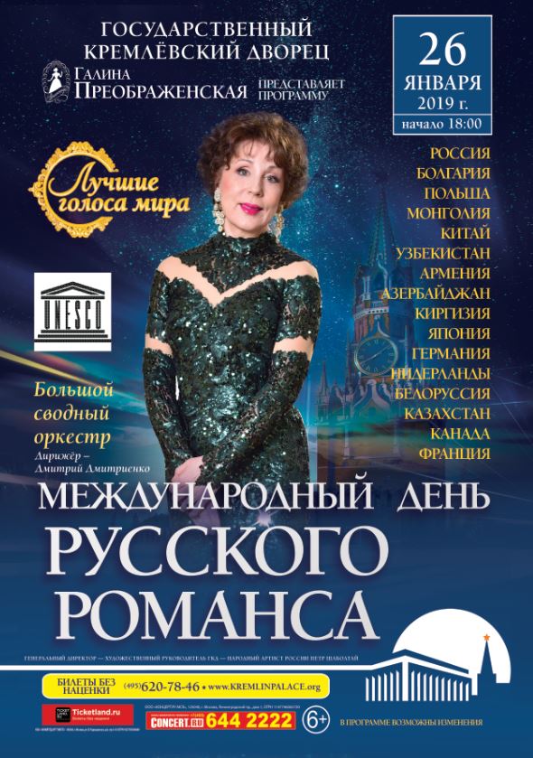 Международный День русского романса по традиции отмечается ежегодно в последнюю субботу января. 26 января 2019 года Галина Преображенская снова приглашает всех звезд и поклонников романса в Кремлевский Дворец. В этот день состоится концерт «День русского романса. Лучшие голоса мира».