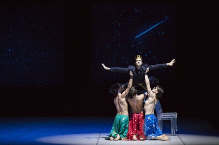 Волхвы (Марк Юбете, Флориан Поль, Лизхонг Ванг) в широких цветных штанах отправляются в путь на фоне сверкающего звездами ночного неба.