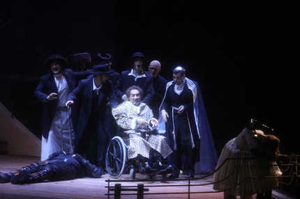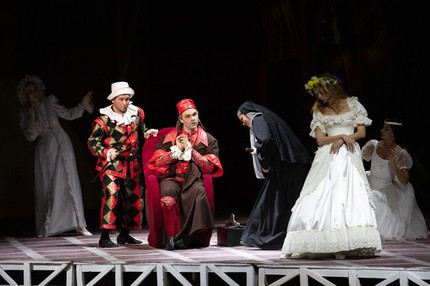 Под стать сюжету, сама постановка напоминает яркую новогоднюю праздничную упаковку, в которой внутреннее содержание ничуть не уступает ее красочной оболочке. М. Панджавидзе уже с самого начала вводит зрителей в мир театра: оркестранты появляются из фойе зала в костюмах начала XIX века (периода создания оперы) и, проходя через весь зрительный зал, дефилируют через боковые проходы в оркестровую яму. А с первых аккордов увертюры режиссер вводит публику за кулисы театра, в гримерную, где актеры, задействованные в спектакле, переодеваются в костюмы комедии dell’arte, примеряя на себя маски скупого старика Панталоне (Дон Паскуале), субретки Коломбины (Норина), хитрого пройдохи Арлекина (Малатеста) и незадачливого влюбленного Пьеро (Эрнесто).