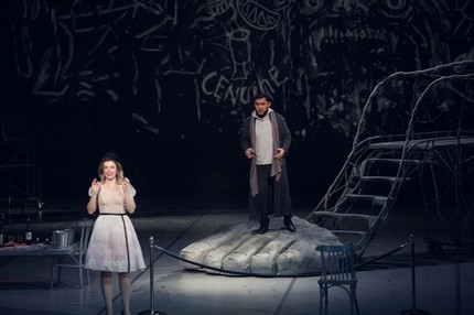 В постановке «Богемы» А. Титель совсем немного сдвигает временные границы, перенося время действия из конца XIX в начало 20–30-х гг. ХХ века. Режиссер делает акцент на художественную богемную составляющую данного периода – в центре сценографии работы известных художников того периода. Это металлические конструкции сюрреалистов – «диван-губы» С. Дали, «ноги» Р. Магритта, «шиппированная» лампа-глаз из «Генрики» П. Пикассо, силуэт кисти руки, фужеров, рождественские шары, свисающие с колосников, и нечто абстрактно-переплетенное, что используется то в виде сидения, то в виде предсмертного ложа Мими. Это, собственно, полотна и одежда по мотивам картин Модильяни, Ван Гога, Сезанна, Пикассо, М.Шагала, Х.Сутина. Весьма оригинально режиссёр трактует финал оперы: статисты за кулисы «перекатывают» кровать, которая стала смертным ложем Мими, и за ними, как за траурной процессией, следуют герои. Уборщица выметает последние бумаги – навсегда ушедшие «страницы» молодости, беспечности и счастья героев. А, возможно, и черновики будущего бестселлера А.Мюрже «Сцены из богемной жизни».