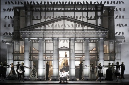 Да и постановка итальянца Давиде Ливерморе (в одном лице режиссера и сценографа), выдержанная в эстетике черно-белых триллеров Хичкока и создающая атмосферу саспенса как средствами абстрактной сценографии, так и с помощью эффектов видеопроекционных технологий, несет всё же, скорее, позитив. Подобный «вердикт» возникает на фоне того беспредела, что царит сегодня в оперной режиссуре в мире, и на фоне явных неудач самогó режиссера, пусть позитив на сей раз и черно-белый (техподдержка графического дизайна и сценографии – компания GIÒ FORMA, разработка видеодизайна – компания D-WOK). О контрастах творчества режиссера рецензенту уже доводилось говорить на основе четырех его постановок в Пезаро, из которых лишь одна – «Кир в Вавилоне» – предстает истинно незабвенным шедевром, также преломляющим тему кинематографа, но в интерактивно-приключенческом ракурсе. Героев «Бала-маскарада» – просто в пандан режиссуре и сценографии – весьма эффектно и стильно одела художник по костюмам Мариана Фракассо, а свет поставил художник по свету Антонио Кастро.