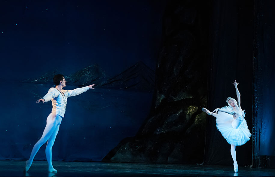 Балет балетов «Лебединое озеро» идёт в Нижнем Новгороде в своеобразной редакции, включающей в себя в значительной степени фрагменты хореографии Юрия Григоровича из его постановки «Лебединого» в Большом театре, хотя автором хореографии указан Юрий Ветров (дирижёр-постановщик — Ренат Жиганшин). Но, в отличие от преимущественно чёрно-золотых декораций Симона Вирсаладзе к спектаклю Большого театра, сценография нижегородского «Лебединого» (художник-постановщик Евгений Спекторов) — в более привычных сине-серебряных тонах. Особенно привлекает взор изображение озера на заднике — тёмно-синяя, явно хранящая в себе тайны вода в обрамлении гладких, безлюдных гор. Эта посверкивающая гладь озера — словно драгоценный камень гигантского магического перстня в «оправе» горных вершин, стоит потереть его — появляются белые лебеди, а если повернуть — чёрные.