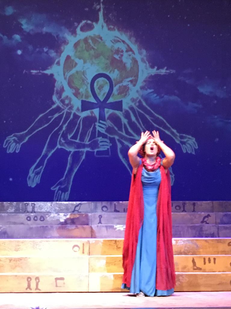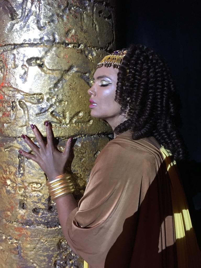 Небольшое зеркало сцены было обыграно максимально, и в этой компактности даже была некая прелесть. Золотые колонны по бокам, силуэты пирамид, ступени и видеопроекции – вот основные элементы сценографии практически на протяжении всего спектакля. Камерность словно приблизила действие к зрителю.