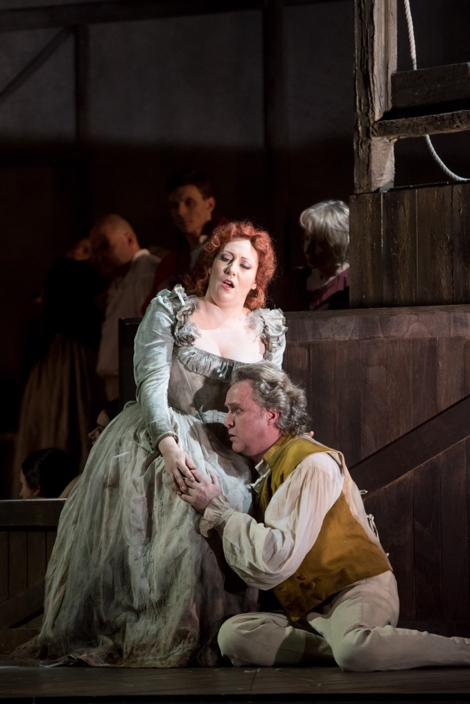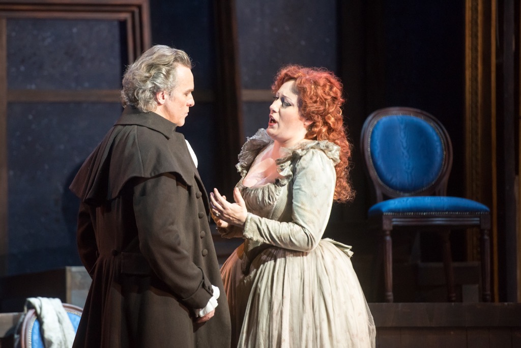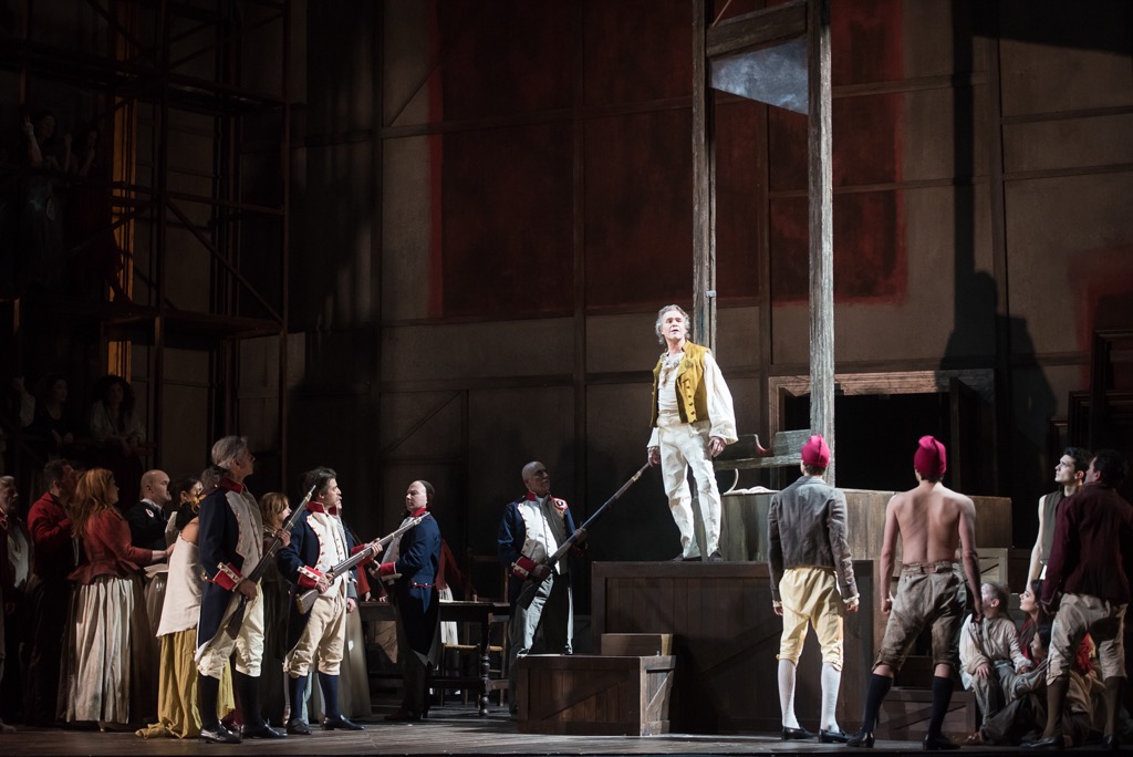 Страшное устройство и полуобнаженный палач (конечно, имеется в виду знаменитый Сансон, который преспокойно таскает туда-сюда корзину для отрубленных голов), — картины не для слабонервных. Гильотина занимает немало места на не слишком большой сцене театра Комунале, и массовым сценам порой тесновато. В во втором акте любопытная толпа на площади взирает на проход деятелей революции, в третьем часть сцены заполняет «офис» революционного судилища, а присутствующие на заседании частью размещены на сцене, а частью на конструкции, напоминающей строительные леса, в четвертом то же пространство легко трансформируется в мрачный каземат тюрьмы Сен-Лазар. Выразительно организованное пространство способствует динамичной разводке мизансцен: их связь с живыми картинами очевидна, и все же они более «живые», чем «картины» (режиссер-постановщик Никола Берлоффа). Выразительные детали добавляют спектакли еще более живости: убийство графини ди Куаньи, которую восставшие пронзают пиками в финале первого действия, присутствие Маддалены на «лесах» в третьем, когда луч света задерживается на ее лице, и в этот момент, может быть, Шенье если не видит, то чувствует ее присутствие.