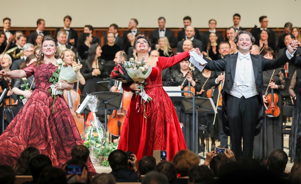 сопрано и дирижер предстали прекрасной парой единомышленников! Творческое единение сопрано и тенора-юбиляра в финальном дуэте Виолетты и Альфреда из «Травиаты» Верди заведомо оказалось еще бóльшим: «жизнерадостный» дуэт исполнителей вовсе не соответствовал сиюминутной трагической ситуации их оперных героев – заучено пелись ноты, но музыку они, увы, не рождали…
