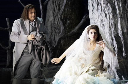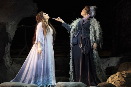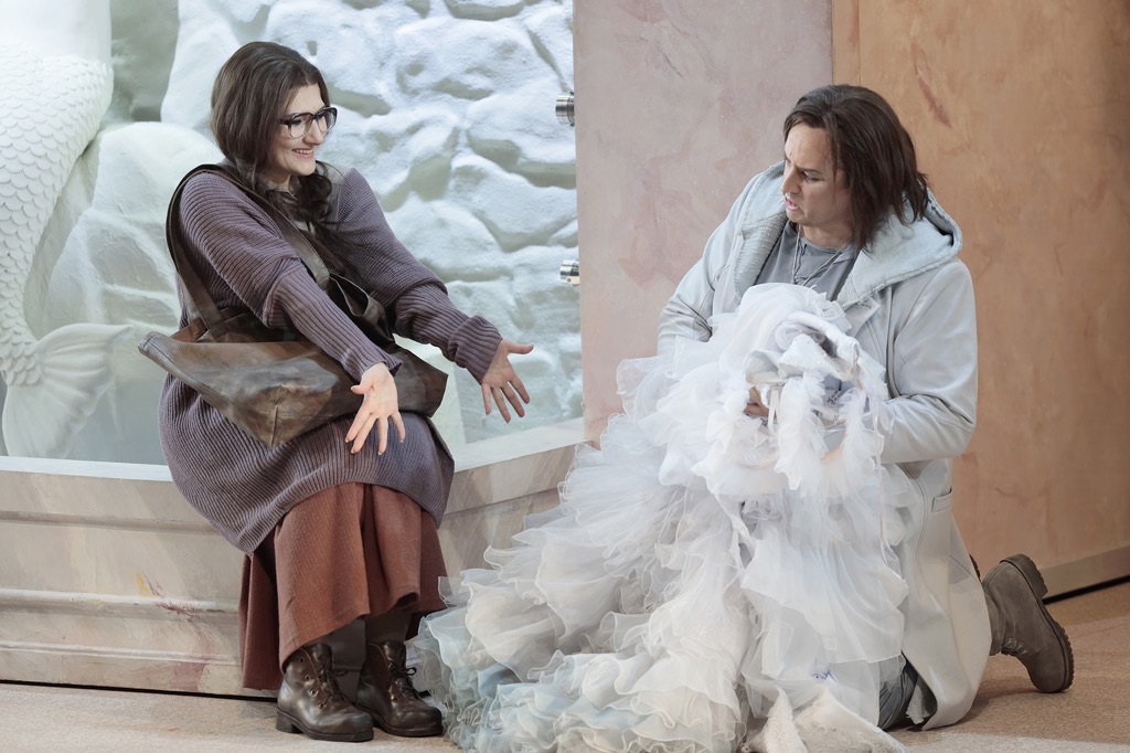 Но в ней между отягощенной эпатажем режиссерско-драматургической концепцией и мощно захватывающей эффектностью самогó оформления нужно провести четкую грань. Режиссеру и его «адвокату»-драматургу антураж сказки с большой изобретательностью и технологическим совершенством предложили сценограф Олег Головко (также делавший и «Дона Паскуале») и видеодизайнер Александр Лобанов, осуществившие это в содружестве с художником по свету Дамиром Исмагиловым. Но костюмы Гали Солодовниковой, когда-то одевшей и «Дона Паскуале» Тимофея Кулябина в Большом, на сей раз – всего лишь банальная «театральная подборка» из разных эпох и стилей. К романтической сказочности (там, где это необходимо) они взывали не сильно, существенно больше «преуспев» не в следовании режиссерско-драматургической концепции, а в «чистом» эпатаже второго акта, ради которого всё и задумывалось: не взять своего «режопера» явно не смогла и на сей раз!