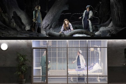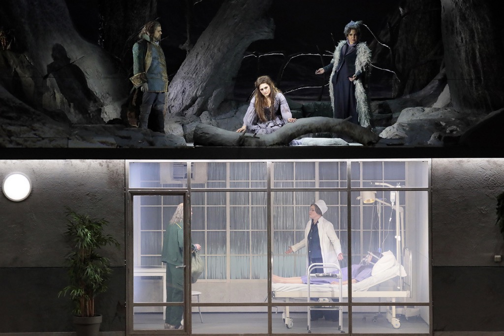 В третьем акте таких двойников – пруд пруди! И это неслучайно, ведь после скандала на несостоявшейся свадьбе, вылившейся в типичный кутеж «с картинками», которые нам, к счастью, не показывают (с лихвой хватило и того, что балетная музыка была бездарно убита вульгарной пантомимой прихода гостей!), настает финальное выяснение отношений внутри любовного треугольника. Русалка-бомжиха, отталкиваемая совсем уже упившимся к тому времени Принцем, неудачно падает, ударяясь головой о бордюр фонтана (между прочим, фонтана с аллегорической скульптурой русалки!), и впадает в кому. О возврате в сказку после такой показательной вакханалии «режоперы» речи уже нет, но сама Русалка-бомжиха – теперь в коме в больнице. А петь-то надо! Только вот кому? Ведь все земные двойники – артисты мимические. И для завершения оперы постановщики в третьем акте придумывают новый «фокус», вновь прибегая к двухэтажной сценографии первого акта.