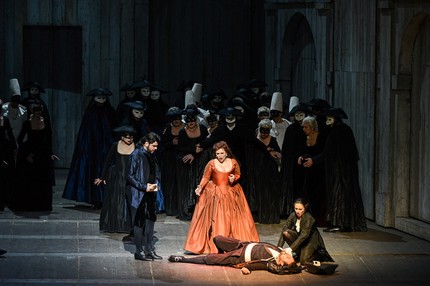 Для режиссёра Александра Шулина работа над гамбургской постановкой оперы Верди «Бал-маскарад» в своё время была, похоже, проходной: в спектакль он особенно не вкладывался, но ничего особенно и не испортил. Персонажи в ярких костюмах двигаются на фоне блёкло-серой деревянной декорации — гимн шведскому экологическому дизайну.