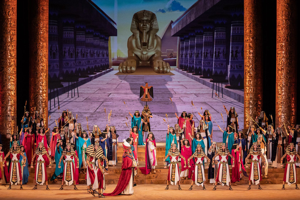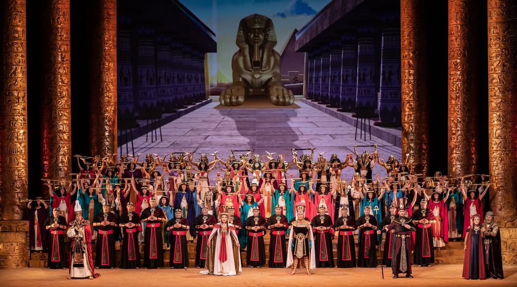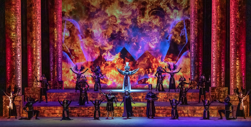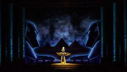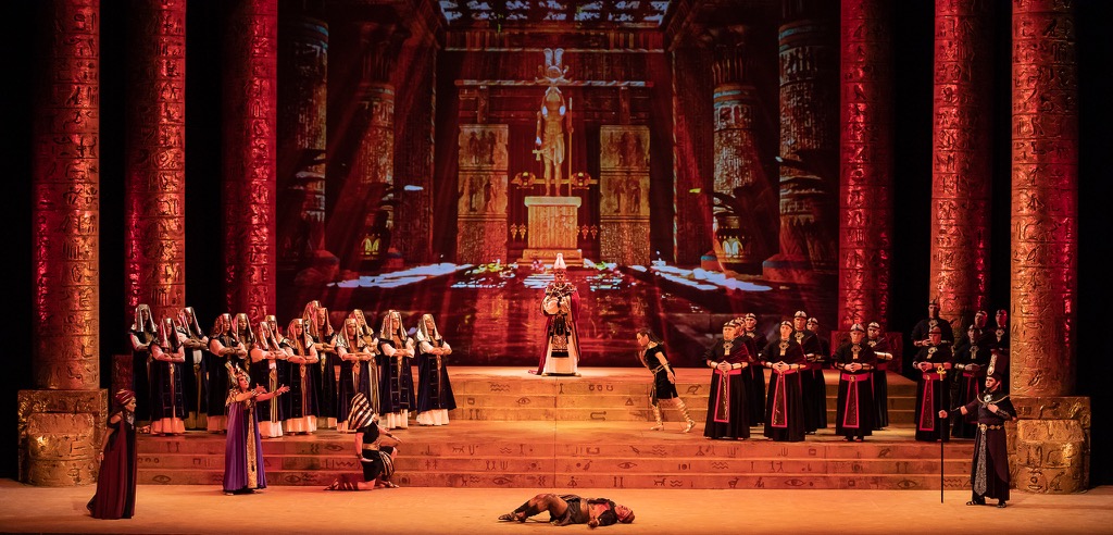 Масштабное зеркало сцены в оперном театре Владивостока — идеальное место для воплощения высокой трагедии. Режиссер сам стал автором и сценографии, и световой партитуры. Огромные колонны цвета состаренного золота, массивные и словно олицетворяющие власть, расположенные по обеим сторонам сцены, ряд ступеней и задник, на котором постоянно меняются видеопроекции. Это может быть культовая для культуры Египта фигура сфинкса и даже... кадры нацистского парада в сцене триумфа, когда возвращается победитель — Радамес (Мэргэн Санданов) с плененными эфиопами. Костюмы персонажей (художник по костюмам Варвара Евчук) выполнены в насыщенно-ярких тонах, характерных для ориентальной культуры, но в то же время они несколько нейтральны, что опять-таки расширяет временное пространство трагедии.
