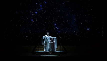 Финал спектакля Алексея Степанюка неожиданно светел: Радамес и Аида в некой условной пещере вдвоем, на них белые одежды с длинными и широкими рукавами, которые при взмахах рук напоминают крылья ангелов. За ними — безграничное звездное небо. Они одни, они любимы, уже никто и никогда их не потревожит. Они прощаются с землей и словно растворяются в облаках, в этой белой изменчивой бесконечности. Их голоса как будто сливаются с невидимым хором ангелов, окружающих их.