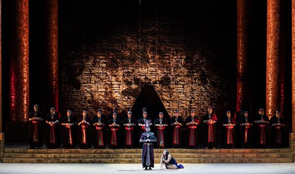 Прочтение оперы Верди Алексеем Степанюком весьма неожиданно. Одним из главных фигур в его спектакле становится верховный жрец Рамфис (Евгений Плеханов). Достаточно загадочный персонаж, которому во многих постановках «Аиды» отведено чуть ли ни служебное место.