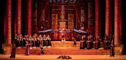 И Диянова, и Бустаманте, наделенные отличными вокальными данными, красивые и темпераментные, — достойные соперницы. Именно как поединок равных и выстраивает их отношения режиссер. Но все же, хоть чуть-чуть, его симпатии на стороне Амнерис. Дочь царя Египта в исполнении этой партии Лаурой Бустаманте — горда, беззащитна в своем давящем положении нелюбимой, и коварна.