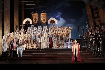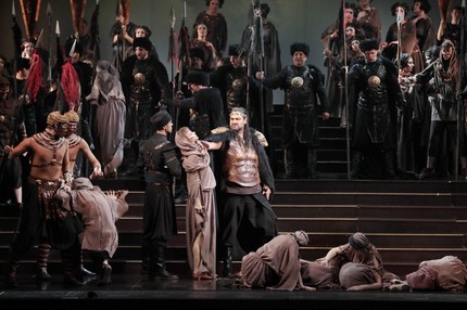 Это, несомненно, так, хотя в сценографии правит бал полная абстракция: общая на все акты спектакля монолитная конструкция – высокая лестница-подиум в ширину сцены, и с ее верха открывается видеопроекционный световой задник «говорящего» неба. Подобный сценографический остов вполне можно назвать и «концертным», но, даже при отсутствии традиционного объемного декора и минимуме «мобильного» реквизита, мизансцены на сей раз очень действенны и театрально-эффектны, а историко-этническая стилизация костюмов как гуннов, так и аквилейцев с римлянами необычайно помпезна и роскошно зрелищна! Так что мы – во власти стихии сáмого настоящего оперного спектакля большого стиля…