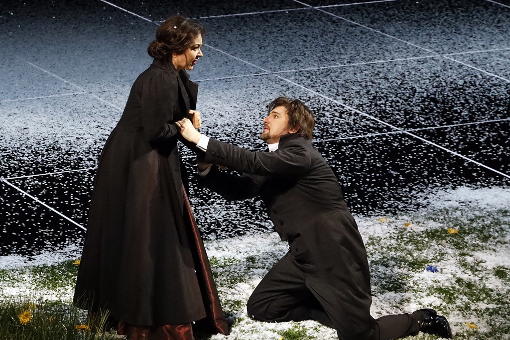 После петербургского бала остается зловещая «матрица» черных стульев-бирюлек, и когда в финальной сцене, локализованной здесь же, на черные стулья и черный паркет падает белый снег, смотрится это вполне эффектно, но совершенно неубедительно! Снегом режиссерская «клюква» замораживается окончательно, хотя никуда не девшаяся, но теперь припорошенная снегом полоска лужайки на авансцене и постоянно присутствующий здесь же «трогательный» островок высокой зеленой травы на левом фланге тщетно пытаются на протяжении спектакля уверить в обратном.