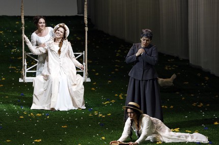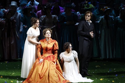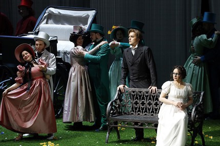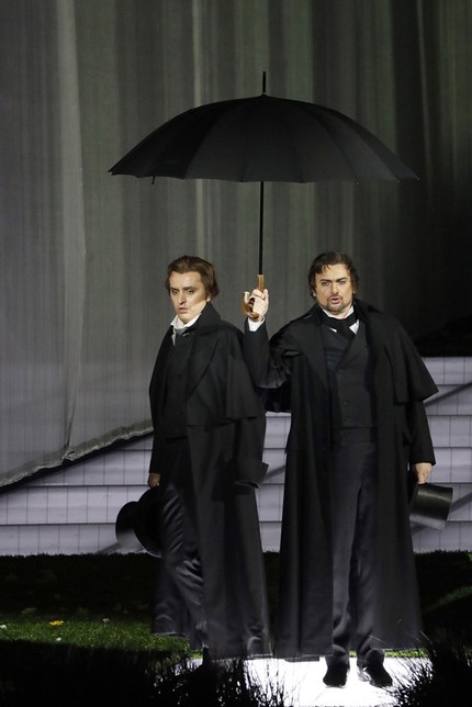 Помещичий уклад и быт русской деревни первой половины XIX века, то, к чему взывает и роман, и опера, вообще остаются за кадром, а вместо этого – разудалый режиссерский китч. От сюжета и музыки он уводит настолько далеко, что мы попадаем на «детский утренник» с забавными зверушками, к числу которых примыкают не только ряженые, но и конкретные герои, будь то Ларина или Филиппьевна, Татьяна или Ольга, Онегин или Ленский. Речи о типажах-архетипах быть не может, ибо их проработки нет и в помине ни на режиссерском, ни на костюмном уровне. Представлен лишь «общий зоопарк» образов, случайно набросанных на зеленую лужайку сцены для игры в оперные бирюльки. Режиссер изо всех сил пытается играть в эту игру, но не больно-то у него это получается!