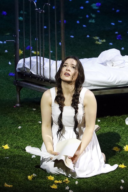 В сцене письма Татьяны посреди лужайки – большая железная кровать, ее «рабочий стол». Статист в костюме Онегина с медвежьей головой, банально обыгрывая сон Татьяны с медведем, подает ей перо-бумагу.