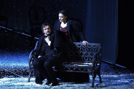 Именно в этом смысл и романа Пушкина, и лирических сцен Чайковского, поэтому снег, которого всегда ждешь в сцене дуэли, но который вдруг начинает идти в заключительной сцене в момент финального выяснения отношений Онегина и Татьяны, – не иначе как происки от лукавого. Именно они и приводят к названному эффекту «запаздывающего режиссерского потенциала». Но весьма показательно и то, что на аванзанавесе перед каждой сценой давались установочные текстовые ремарки места действия, и это, похоже, единственный способ для режиссера сказать об этом зрителю, если сделать это средствами театра он просто не может…
