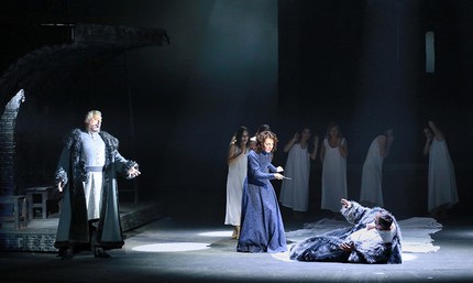 В финале на вершине универсальной сценографической конструкции, когда основная масса раскольников – внизу, выстраивается «грядка артишоков», но не «россиниевская», а «сорокинская»: это души главных героев. Попробуй, разгляди в темноте, кто есть кто, но в режиссерский «септет» душ уже умершие персонажи – Досифей, Марфа, княжич Андрей Хованский и их убитый ранее «соратник» князь Иван Хованский – попасть должны были однозначно. Еще троих режиссер добавляет к ним уж не из стана ли «врагов», к финалу оперы еще живых? Что ж, исход земной жизни – для всех один. И для отправленного в ссылку опального князя Голицына, и для главного идеолога заговора против Хованских боярина Шакловитого, и, наконец, для ставшей яблоком раздора между отцом и сыном Хованскими лютерки Эммы. К тому же, теперь по «вольтерьянской» прихоти режиссера она вдруг становится еще и орудием в механизме организованного Шакловитым заговора.
