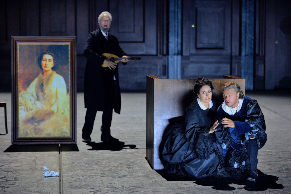Захватывающе, шокирующе, хорошо и — страшно скучно! Признаться, я был сильно удивлён, что ни один из рецензентов (и наших, и немецких) не упомянул о том, что вся концепция Барри Коски вот прямо комплексно вынута из шедшего здесь до 2015 года «Парсифаля» Штефана Херхайма. Тем, кто видел спектакль Херхайма, смотреть представление Коски несколько тоскливо, поскольку все трюки, все намёки, все композиторские интерьеры (без живых ньюфаундлендов, правда) были использованы у упомянутом спектакле Херхайма. Но это неважно, в конце концов. Проблема в целом очень остроумной версии Коски, подробно описанной моими коллегами в разных рецензиях, даже не в том, что на сцене почти все солисты загримированы под Вагнера (молодой, пожилой, подрастающий Вагнер, Вагнер тут, Вагнер там, Вагнер повсюду — прямо «одно сплошное телевидение»), что сильно затрудняет возможность отслеживать сюжетные перипетии, а в том, что мы видим на сцене комическую версию трагического.