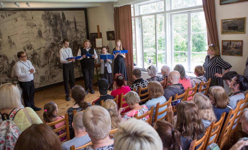 Одним лишь Всенощным бдением вклад Вокального ансамбля Екатеринбургской духовной семинарии в фестивальную программу не ограничился. На следующий день при его участии в том же храме прошла утренняя Литургия (также с включением в нее музыки Поленова), а днем состоялся и не анонсированный в программе фестиваля мини-концерт в Большом доме усадьбы. Он прошел в просторном зале второго этажа, и в нём снова, но уже с художественно-целевым прицелом, звучала «воскресшая из небытия» духовная музыка Поленова. Идеальной «декорацией» для этого как раз и стал занимающий всю стену зала огромный черно-белый – тонированный углем – эскиз (1885) сáмой знаменитой картины Поленова «Христос и грешница» (1888). Этой осенью, что для такой большой картины едва ли не сенсация, на выставку в Москву из Петербурга – из Русского музея – пожалует и она!