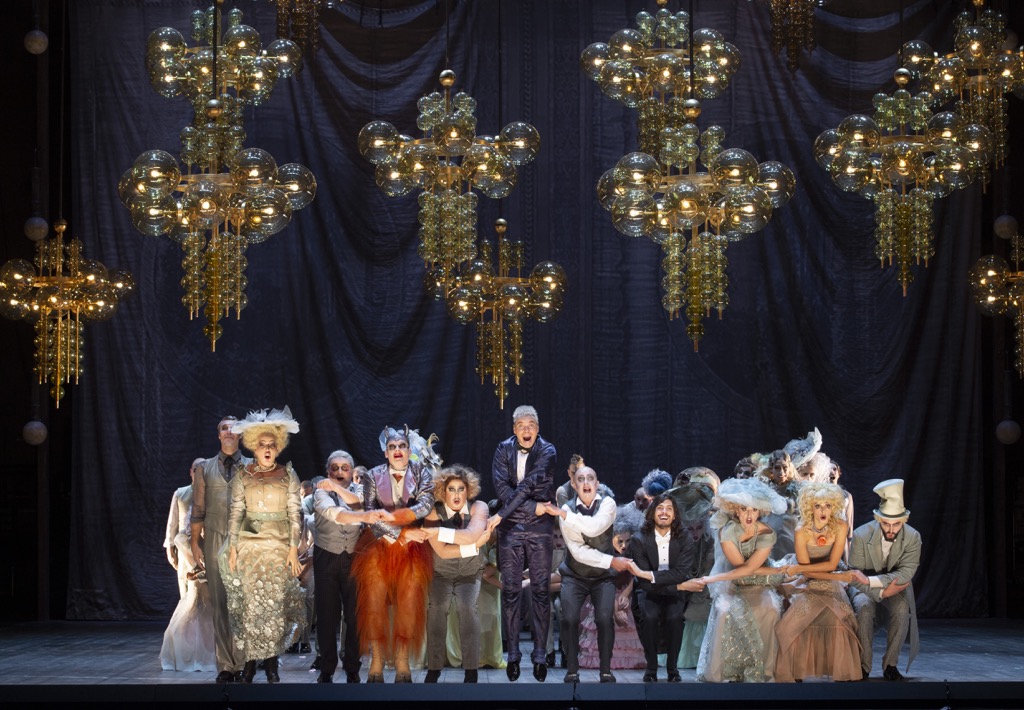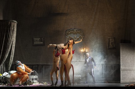 Зальцбургский «Орфей в аду» тоже окрашен в тона берлинского кабаре, с его провокационностью и мрачноватой атмосферой, пропитанной сексом и физиологическим юмором. Художник-постановщик Руфус Дидвисус с бешеной скоростью прокручивает сценографический калейдоскоп: камерная атмосфера оффенбаховского театра-бонбоньерки сменяется стильным Олимпом в духе Belle Époque и феерическим Адом, где огромный зеленый черт на огненном колесе пускает фейерверки изо всех мест. Отто Пихлер запускает хореографическую пиротехнику: балет сексуальных пчелок, адские танцоры с отрубленными головами в руках и канкан со шпагатами. Костюмы Виктории Бер в карнавальном безумии сочетают все элементы всех мыслимых эпох.