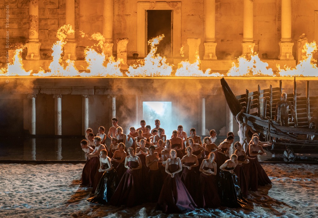 Как всегда, Стефано Пода удалось заворожить зрителей необычностью постановки. Спектакль начался с танца дервиша, а закончился исполнением болгарской народной песни. Перед публикой предстала мифическая река Стикс, по которой плывет лодка Харона. Настоящая водная стихия, развернувшаяся на мраморной арене, поразительно сочеталась с огненными всполохами, удивительно передавая атмосферу царства теней. Вся сцена была покрыта 20 тоннами белоснежного песка. Должна признаться, иногда мне казалось, что у нас не хватит ресурсов для реализации всех идей режиссера, но, Слава Богу, нам это удалось. И поверьте, результат полностью оправдал ожидания! Используя энергию воды, огня и песка и только четыре цвета: белый, бежевый, красный и черный, Стефано создал впечатляющую картину античного мифа.