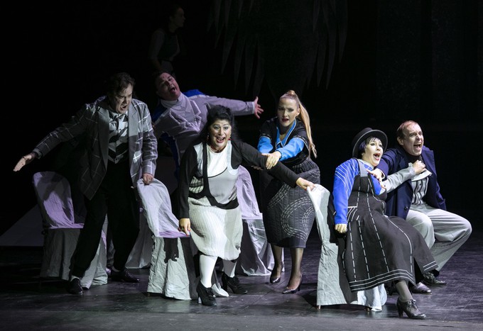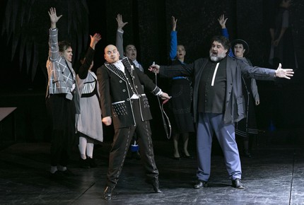 Кроме Ринуччо и Лауретты, все игроки, в том числе и Джанни Скикки, ищут в этой игре на выживание собственную меркантильную выгоду, и схватка между «одним в поле воином» и целой «армией» родственников всех мастей (не считая Ринуччо, в ней – восемь человек) предстает музыкально-позиционным «сражением» на придуманном игровом поле. Все мизансцены спектакля более чем условны, будто и впрямь подчинены правилам игры с заранее просчитанной диспозицией. И неслучайно ансамбли и реплики игроков становятся базисом, в то время как ариозные фрагменты «неигроков» (Ринуччо и Лауретты) выглядят вторжением на игровое поле извне, ненадолго останавливающим развитие сюжета ради чистой музыки. Совсем другое дело в этой постановке – ариозные фрагменты партии Джанни Скикки, которым присуща непрерывно-игровая драматургическая действенность.