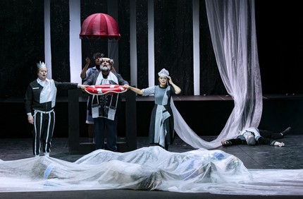 Реалистичности и привычной образности нет ни в сценографии, ни в костюмах, а создание флорентийского колорита в духе оригинального сюжета в задачу постановщиков, как видно, не входило, тем более в наше «чудесное» время разгула «режоперы», когда это могло бы выглядеть едва ли не моветоном! Похоже, задача была – не рассказать анекдот средневекового прошлого через психологические портреты его участников, а проследить анатомию отдельно взятой аферы. Зрителей вдруг погрузили в иррационально-абстрактное измерение, и в «театральном вакууме», воспринятом на редкость легко и даже с азартом, де-факто возник театр абсурда, в котором всё было подчинено игре в фальсификацию.