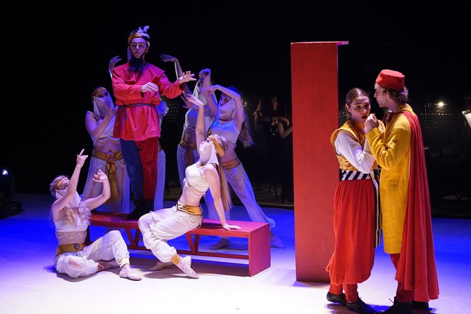 Постановка идет без декоративного оформления и вмещающей сценографии, а лишь с минимумом универсально-подручного реквизита. Кроме шести скамеек и необходимого для той или иной новеллы предметного «антуража», в распоряжении ансамбля актеров нет ничего, хотя в каждой новелле им необходимо рассказать и показать всё, словно на замысловатом этюде при поступлении в театральный вуз. И они ведь действительно всё рассказывают и показывают, а удается это всем – еще раз подчеркнем с нескрываемым восторгом – поразительно легко и задорно, абсолютно естественно и непринужденно…