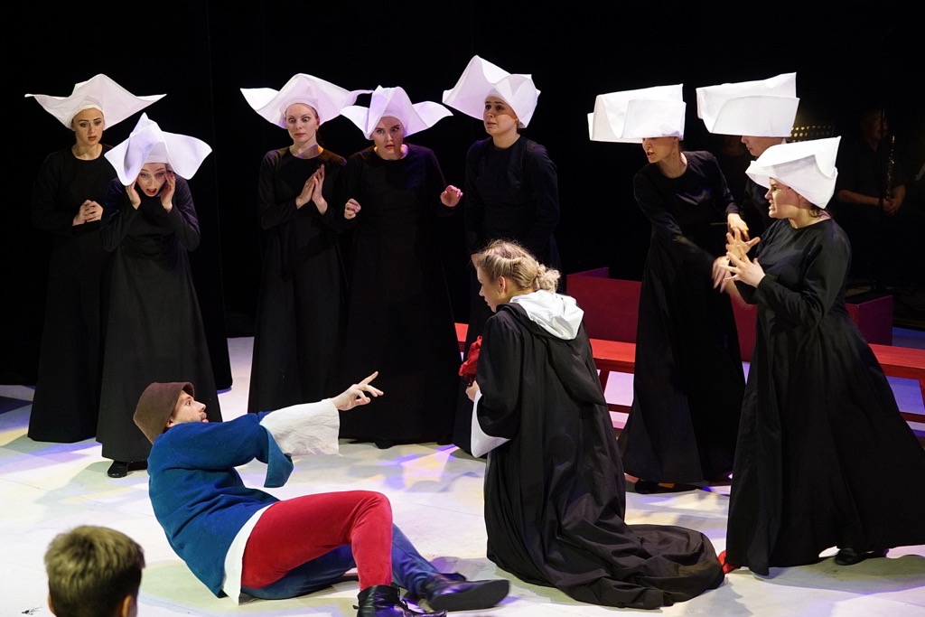 Однако заведомо скупую в аспекте зрелищности и, по всей видимости, намеренно культивируемую постановщиками студийность, которая как раз и дает актерам широкий простор для их множественного перевоплощения, художник Мария Медведева разумно дополняет пестроцветно «веселой» классикой средневекового костюма. Психологической сюжетной яркости это добавляет яркости внешнего колористического настроя. Но ведь чрезвычайно важна и пластическая составляющая актерского действа, и, беря этот аспект в свои руки, балетмейстер Ирина Новик динамично живым мизансценам режиссера придает финальный лоск пластической отделки. В результате бравый «триумвират» режиссера, художника и балетмейстера уверенно правит театральный бал с поразительной творческой слаженностью, просто с какой-то сверхпрофессиональной эффективностью и отдачей!