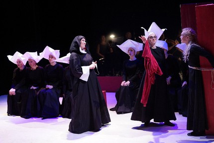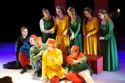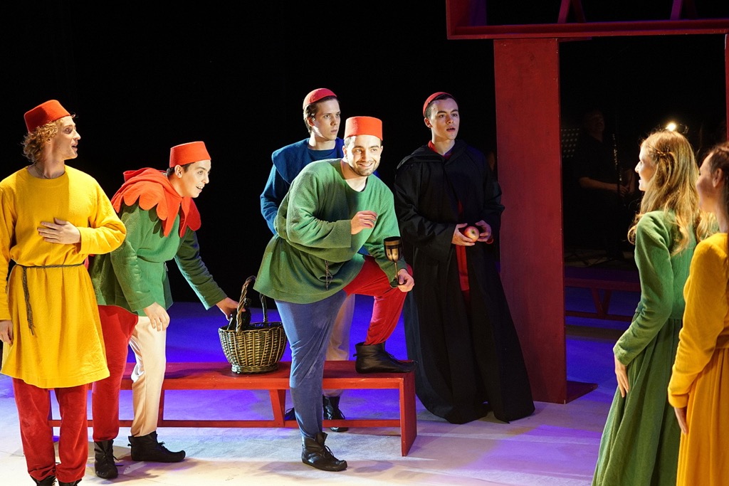 Прямого отношения – никакого, но если хорошенько подумать, что и сделал режиссер спектакля, то станет ясно: из избранных моралистических новелл «Декамерона» Боккаччо, необъятное содержание которого простирается от фривольно-эротического до жизненно-драматического и даже трагического, легко, но так кажется лишь на первый взгляд, создать театральное действо, отказать которому в занимательности вряд ли будет возможно. А так ведь и вышло! Слово в нём главенствует, а вокальная субстанция – его оттеняет, обогащая ткань постановки новыми красками и оттенками эмоций, ощутить которые в разговорной речи заведомо невозможно. Естественно, режиссер хорошо подумал не один, а с автором русскоязычной пьесы в одном прологе и шести новеллах Ольгой Погодиной-Кузминой.