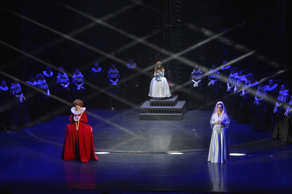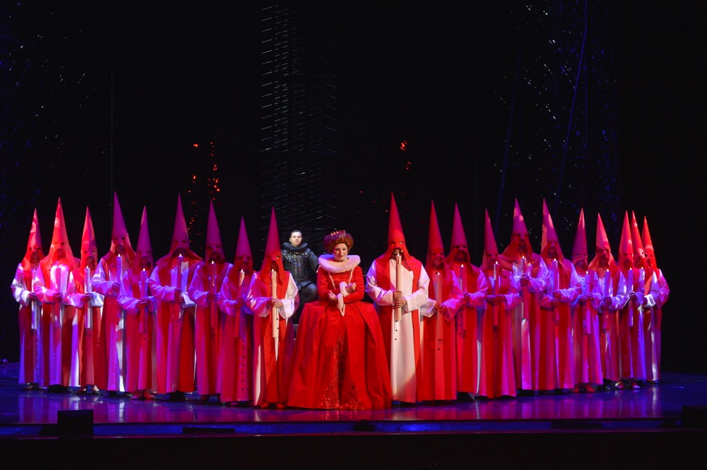 8-метровые раздвижные декорации из прозрачного пластика и металла, стильная мебель на стыке готики и хайтека, сложный свет – все это достойно уровня европейских сцен. В ту же стилистическую сторону намеренная «современность» некоторых модных приемов, например, мужчины (шуты и фавориты) в женских платьях. Не новый, но безотказно работающий прием – девочка с куклой (инфантильная душа Елизаветы? незаконная дочь? привет Анне Нетребко?) – для умиления зрителей и разрядки напряжения. Единственное принципиальное замечание можно сделать по цветовым решениям: если второй акт (акт Елизаветы) более разнообразен по цветам, то первый акт Марии практически полностью выдержан в «оттенках серого» (кроме красных платьев шутов, пародирующих Елизавету же), что, конечно, гиперсовременно и по-европейски, но несколько утомляет.